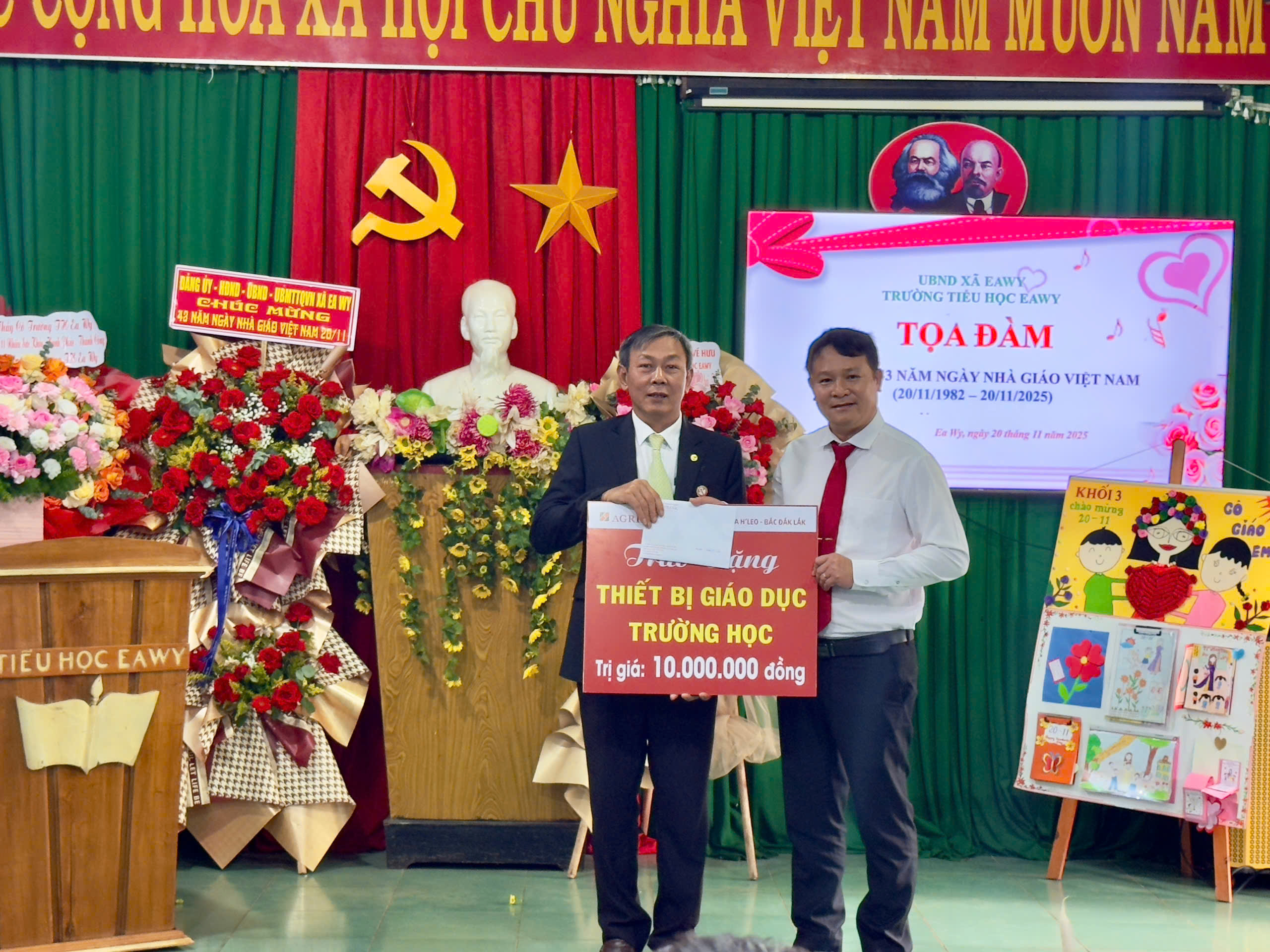 Đại diện cho GV nghỉ hưu và Ban đại diện CMHS đã gửi tặng HĐSP nhà trường lẵng hoa chúc mừng và lời cám ơn tới nhà trường đã quan tâm đến việc học tập của học sinh và tri ân những thế hệ nhà giáo đi trước. Nhân sự kiện này, ngân hàng AGRIBANK – Chi nhánh EaHleo đã tặng nhà trường 10.000.000đ để mua sắm, bổ trợ TBDH.