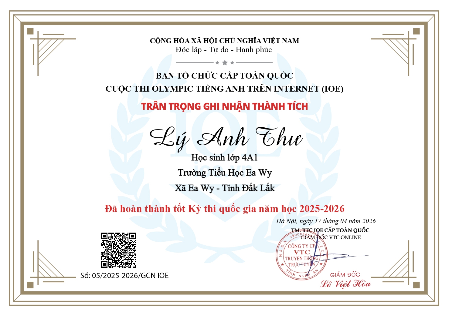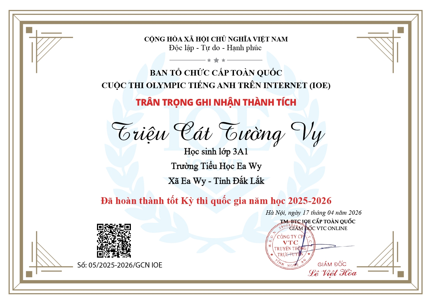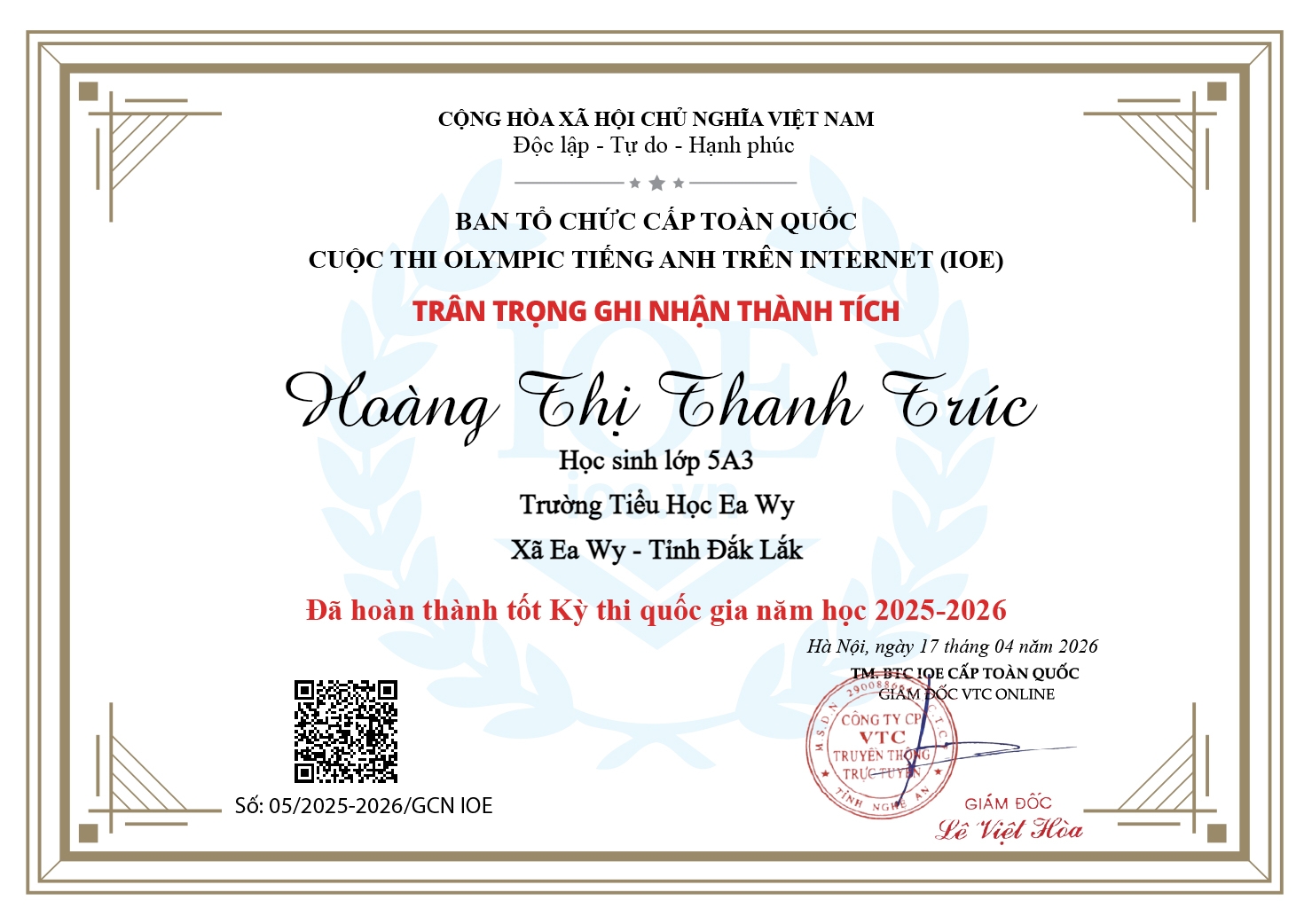 Nhà trường, thầy cô và quý phụ huynh rất tự hào về kết quả kỳ thi IOE cấp quốc gia mà các em đã đạt được. Sự dìu dắt của các cô giáo và sự cố gắng của các em đã mang lại kết quả rất đáng biểu dương. Xin chúc mừng các em:Em Trịnh Phi Linh đạt Huy chương Bạc khối 5 kỳ thi cấp quốc gia; Em Sầm Hoàng Thiên đạt Huy chương Đồng khối 4 kỳ thi cấp Quốc gia và 31 em đã Hoàn thành tốt kỳ thi cấp Quốc gia.