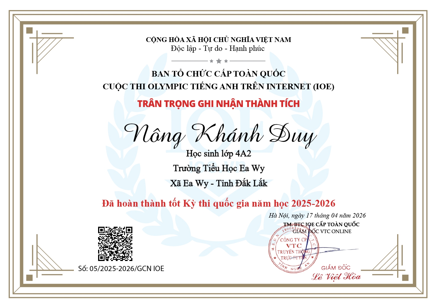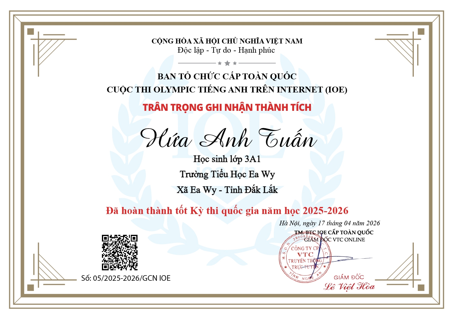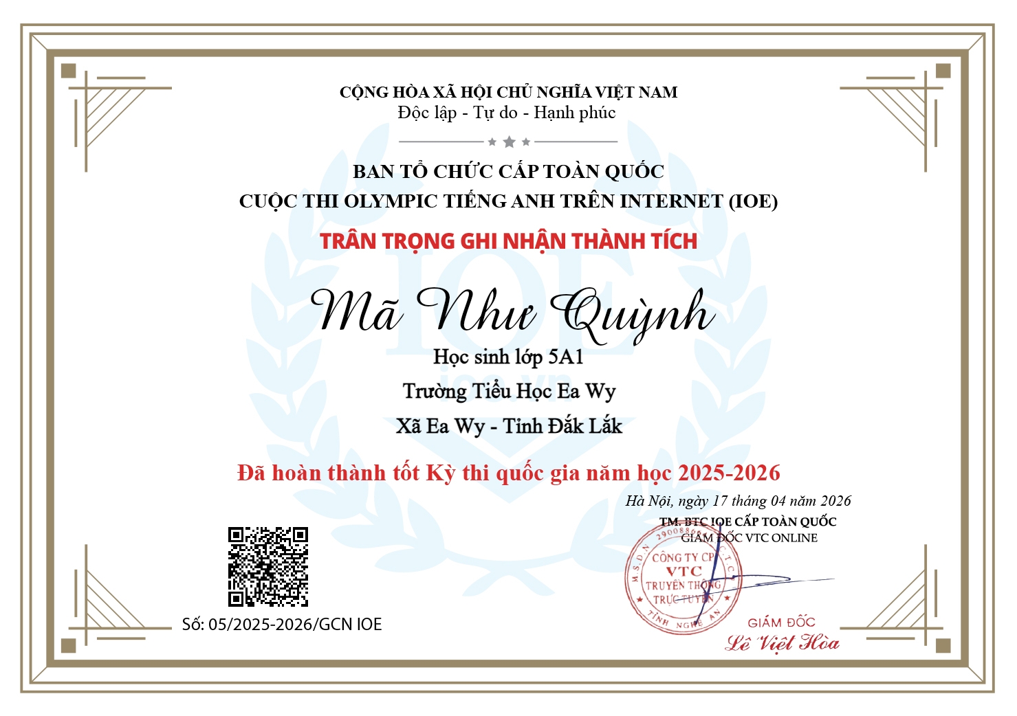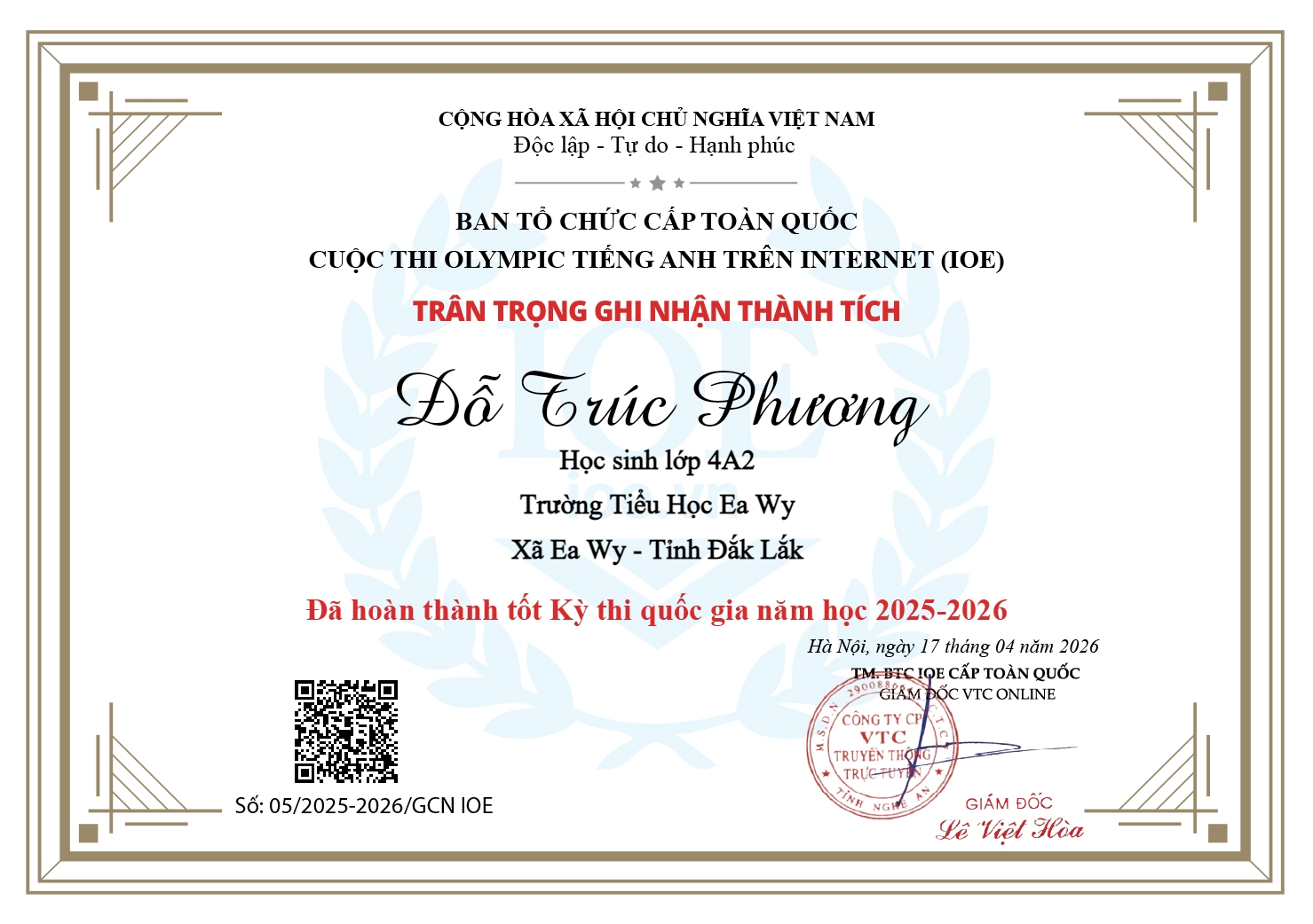 Nhà trường, thầy cô và quý phụ huynh rất tự hào về kết quả kỳ thi IOE cấp quốc gia mà các em đã đạt được. Sự dìu dắt của các cô giáo và sự cố gắng của các em đã mang lại kết quả rất đáng biểu dương. Xin chúc mừng các em:Em Trịnh Phi Linh đạt Huy chương Bạc khối 5 kỳ thi cấp quốc gia; Em Sầm Hoàng Thiên đạt Huy chương Đồng khối 4 kỳ thi cấp Quốc gia và 31 em đã Hoàn thành tốt kỳ thi cấp Quốc gia.